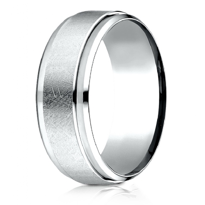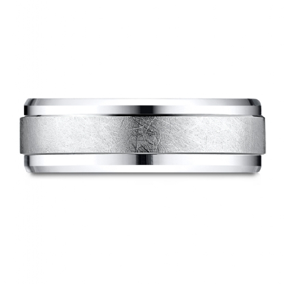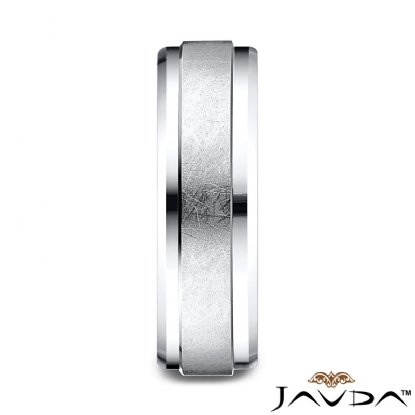 This incredible 7mm wide comfort fit carved wedding band features a swirl finish along the center and high polished drop beveled edge. This modern men's wedding band is long lasting and comfortable to wear everyday, made from 14k white gold. Available in white gold, yellow gold and rose gold.