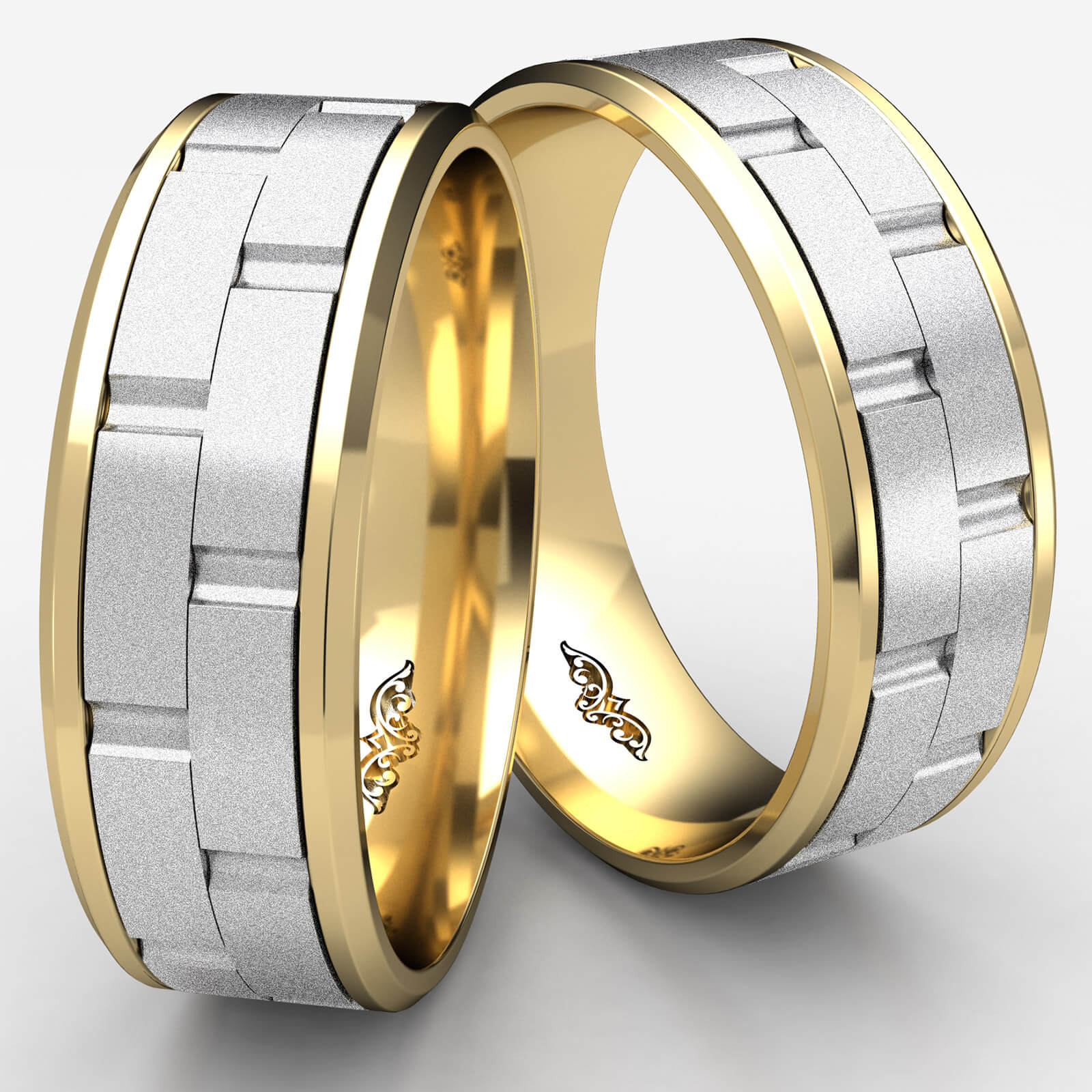 This unique comfort fit chain link design carved wedding band features brick pattern along the center in white gold and high polished drop beveled edge in yellow gold. This 8mm men's weddding ring create a stunning effect as this multi gold design band reflects light. Made from quality 14k two tone gold.