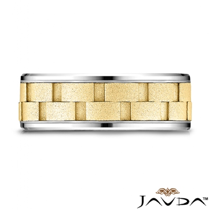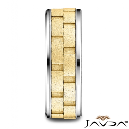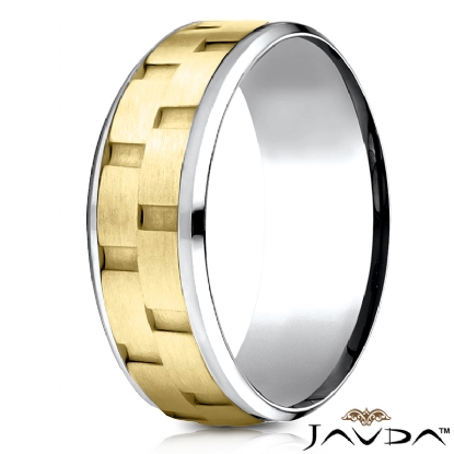 An elegant comfort fit chain link design carved wedding band features a satin finished brick pattern along the center in yellow gold and high polished drop beveled edge in white gold. This 8mm men's weddding ring create a stunning effect as this multi gold design band reflects light. Made from quality 14k two tone gold.