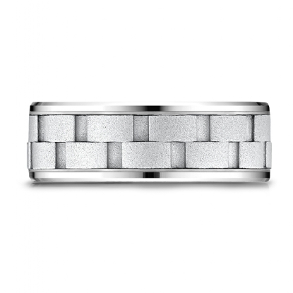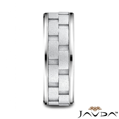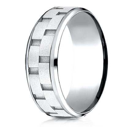This handsome comfort fit chain link design carved wedding band features a satin finished brick pattern along the center with high polished drop beveled edges. This stunning men's weddding ring made from 14k white gold, measures 8mm wide. Available in white gold, yellow gold and rose gold.