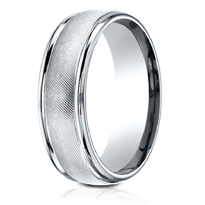 This comfort fit unisex carved wedding band features a florentine center finish with a high polished round edges. This stunning wedding ring for men's and women's is long lasting. Made from 14k white gold, measures 7mm wide. Available in white gold, yellow gold and rose gold.