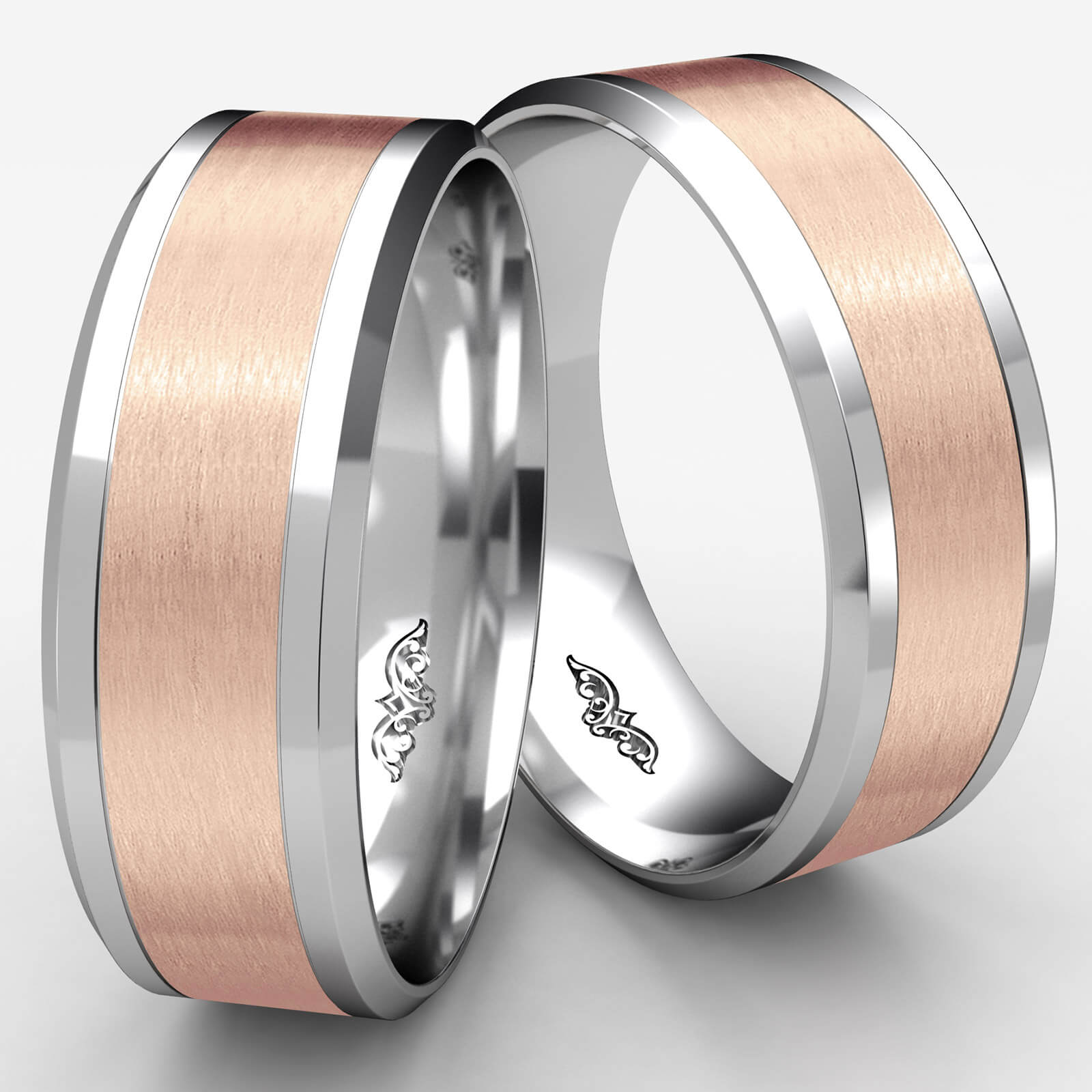 Stunning comfort fit unisex carved wedding band features a satin finish center in rose gold with a polished drop beveled edges in white gold. This solid wedding ring for men's and women's is long lasting and comfortable to wear everyday. Made from quality 14k two tone gold, measures 8mm wide.