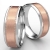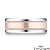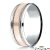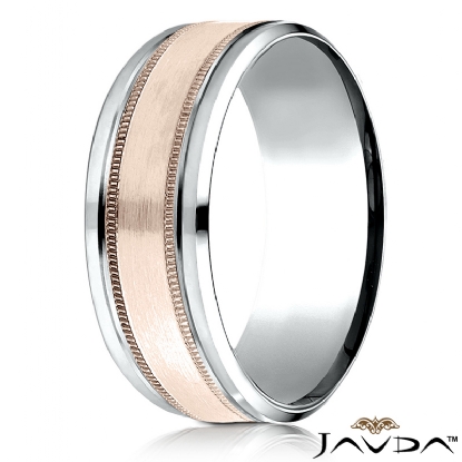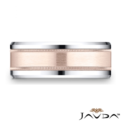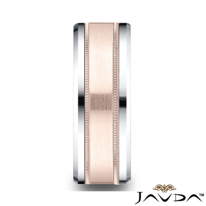 This stylish 8mm wide comfort fit carved wedding band features a satin finished center with milgrain design in rose gold and polished drop beveled edges in white gold. Expertly crafted this modern wedding ring for men's is comfortable to wear everyday, made from 14k two tone gold.