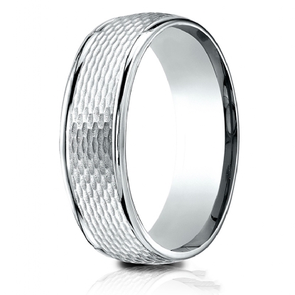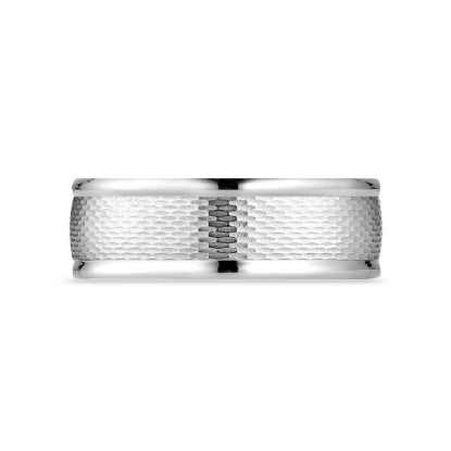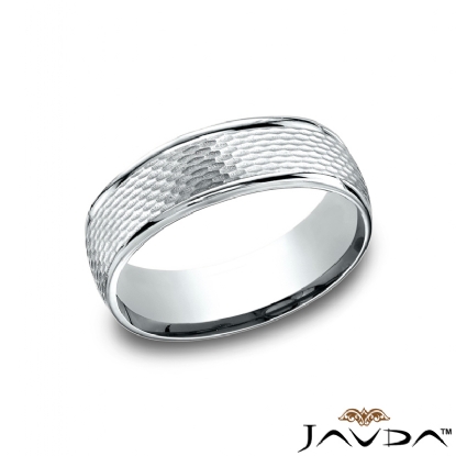 This 7.5mm wide comfort fit unisex carved wedding band features a mesh finished center with high polished round edges. This beautiful ring for men's and women's is long lasting, made from 14k white gold. The bold width and comfort fit interior creates an unique style. Available in white gold, yellow gold and rose gold.
