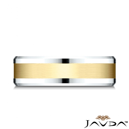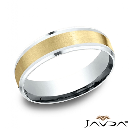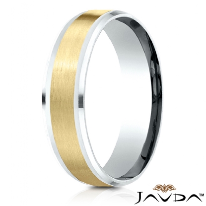 This gorgeous 6mm wide comfort fit unisex carved wedding band features a satin finished center in yellow gold with drop beveled edge in white gold. This solid wedding ring for men's and women's is long lasting and comfortable to wear everyday. Made from 14k two tone gold for a stylish look.