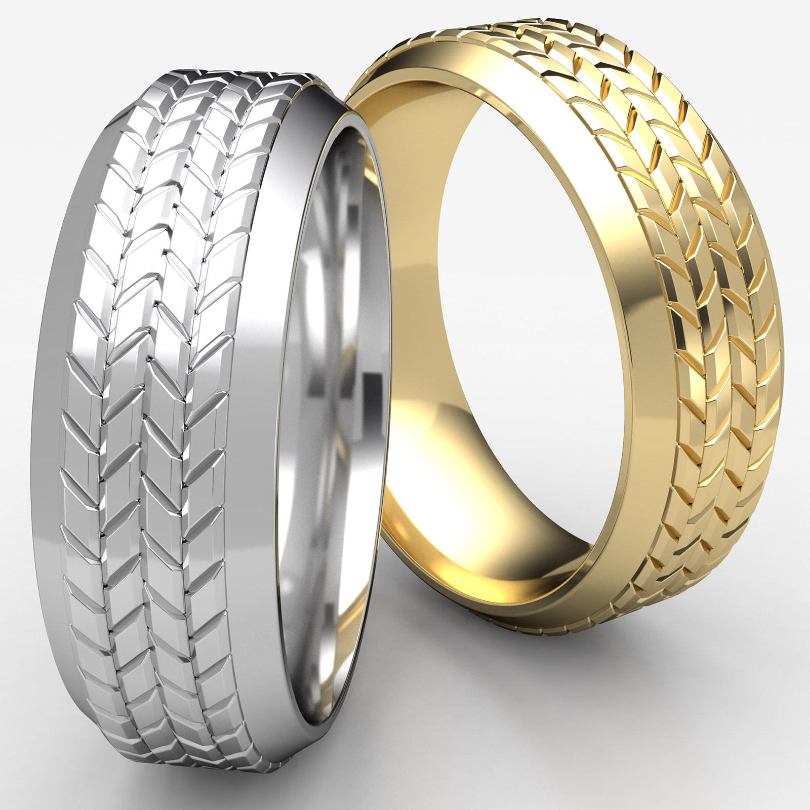 This incredible comfort fit carved wedding band features a tire tread pattern along the center with high polished beveled edge. Expertly crafted this modern ring for men's is comfortable to wear everyday. Made from 14k white gold, measures 8mm wide. Available in white gold, yellow gold and rose gold.