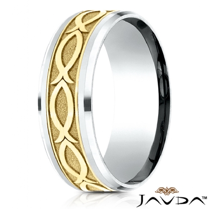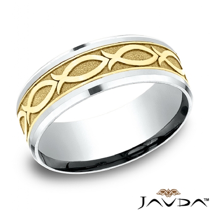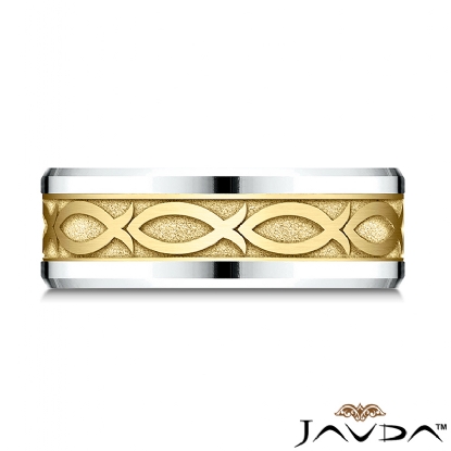 A uniquely sculpted comfort fit unisex carved wedding band features a fish pattern symbol for christianity along the center with high polished drop beveled edges. The gorgeous wedding band for men's and women's is comfortable to wear everyday. Made from 14k two tone gold, measures 8mm wide.