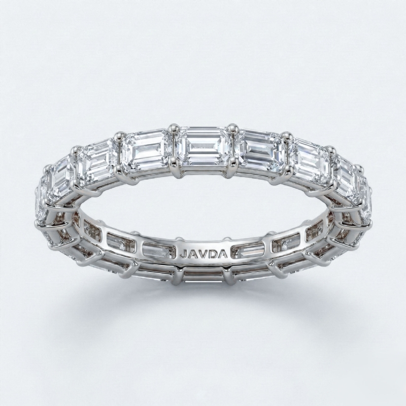 This dazzling emerald cut HPHT lab-grown diamond crafted in 14k white gold. This beautiful eternity wedding band features 1.85 carat emerald diamond secured with shared prong. Our eternity bands are crafted meticulously to perfectly fit your finger, also available in 14k & 18k white gold, yellow gold, rose gold and platinum 950. If you don't find your desired jewelry, please don't hesitate to contact our designer to make your custom jewelry design