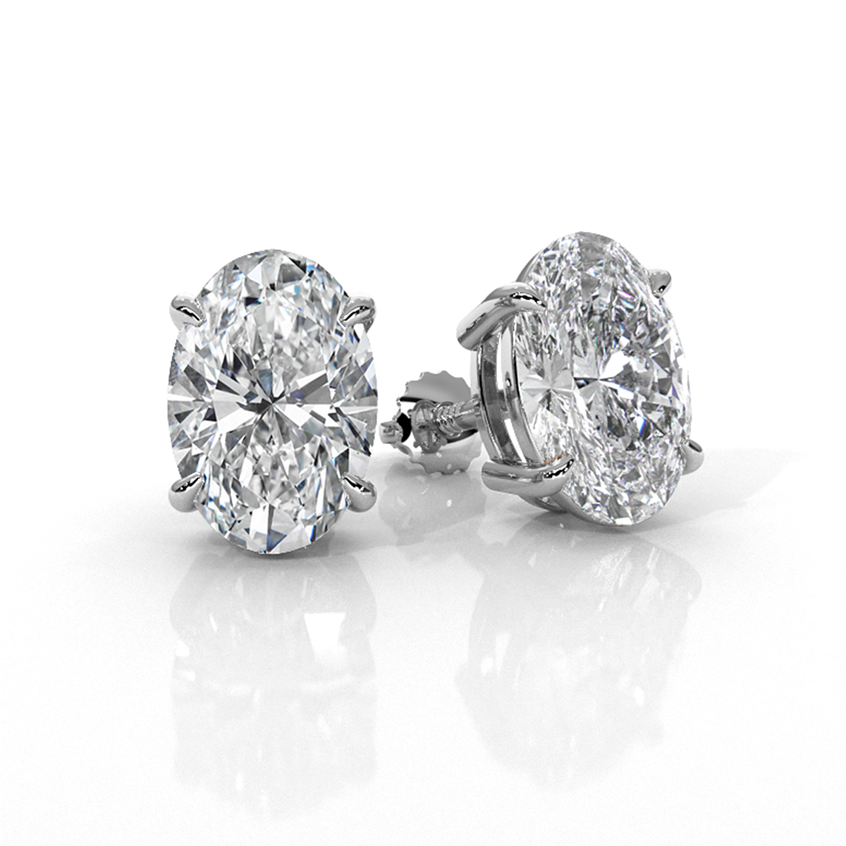 This shimmering claw prong basket style oval lab grown diamond women's stud earrings, meticulously handmade in 14k white gold and IGI Certified. Showcasing a dainty 4.00 ctw. carat oval diamond securely anchored with claw prongs. Perfect gift for her! Also available in 14k & 18k white gold, yellow gold, rose gold and platinum 950. If you don't find your desired jewelry, please don't hesitate to contact our designer to make your custom jewelry design