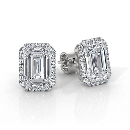 This exquisite pair of claw prong halo emerald lab grown diamond women's earrings crafted in 14k white gold. These earrings features 3.24ctw. carat emerald diamond secured with claw prong IGI certified. Also available in 14k & 18k white gold, yellow gold, rose gold and platinum 950. If you don't find your desired jewelry, please don't hesitate to contact our designer to make your custom jewelry designs.