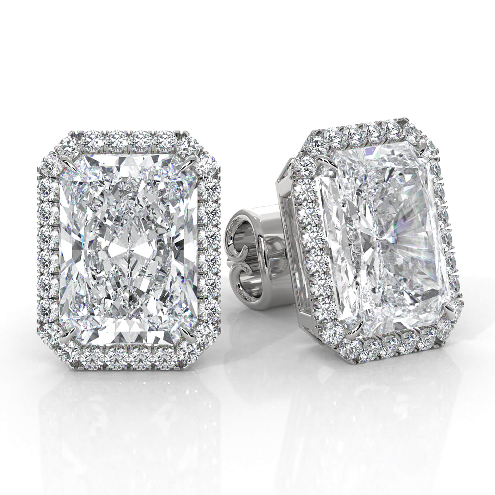 Beautiful claw prong women's radinat lab grown diamond earrings made in 14k white gold. This elegant diamond earrings showcases 6.56ctw. carat center radiant diamond secured with claw prongs and 0.00ctw. side tiny round diamond with prong setting. Also available in 14k & 18k white gold, yellow gold, rose gold and platinum 950. If you don't find your desired jewelry, please don't hesitate to contact our designer to make your custom jewelry design.