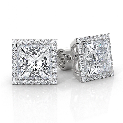 Stunning pair of halo princess lab grown diamond women's earrings made in 14k white gold. These beautiful earrings features 6 ctw. carat princess diamond secured with claw prong setting and 0.36 ctw side tiny round diamond with french u cut pave setting,certified by IGI. Also available in 14k & 18k white gold, yellow gold, rose gold and platinum 950. If you don't find your desired jewelry, please don't hesitate to contact our designer to make your custom jewelry design.