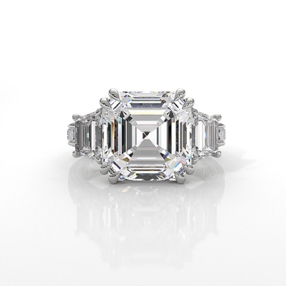 A stunning classic that will never go out of style with this timeless 3 stone asscher lab grown diamond engagement ring are crafted in 14k white gold, this engagement ring features 6.45 ctw asscher diamond and 2.25 ctw trapezoid shaped side diamonds secured with prong setting. Make a striking statement by wearing this ring alone, or pair it with other. Also available in 14k & 18k white gold, yellow gold, rose gold and platinum 950. If you don't find your desired jewelry, please don't hesitate to contact our designer to make your custom jewelry designs.