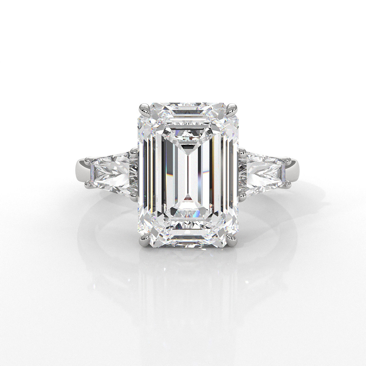 The classic 3 stone emerald cut lab grown diamond engagement ring expertly fashioned in 14k white gold and certified by IGI. This mesmerizing anniversary ring are crafted to enhance any ensemble, featuring a 4.09 ctw. emerald diamond and 1.29 ctw. side diamond secured with claw prong setting. Also available in 14k & 18k white gold, yellow gold, rose gold and platinum 950. If you don't find your desired jewelry, please don't hesitate to contact our designer to make your custom jewelry designs.