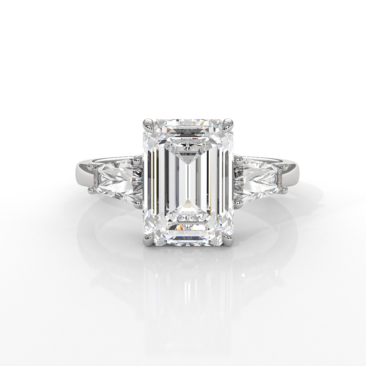 Sparkling 3 stone women's emerald shape lab grown diamonds, meticulously crafted in 14k white gold and certified by IGI. These gorgeous anniversary ring are designed to raise any outfit, showcasing 3.04 ctw. emerald diamond and 1.4 ctw side stone diamond securely held in place by prong setting. Also available in 14k & 18k white gold, yellow gold, rose gold and platinum 950. If you don't find your desired jewelry, please don't hesitate to contact our designer to make your custom jewelry designs.