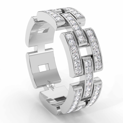 An handsome chain link men's diamond eternity wedding band made from quality 14k white gold. This hot wedding ring features 1.3 carat round diamonds in a micro pave setting beautifully set on chain link pattern.