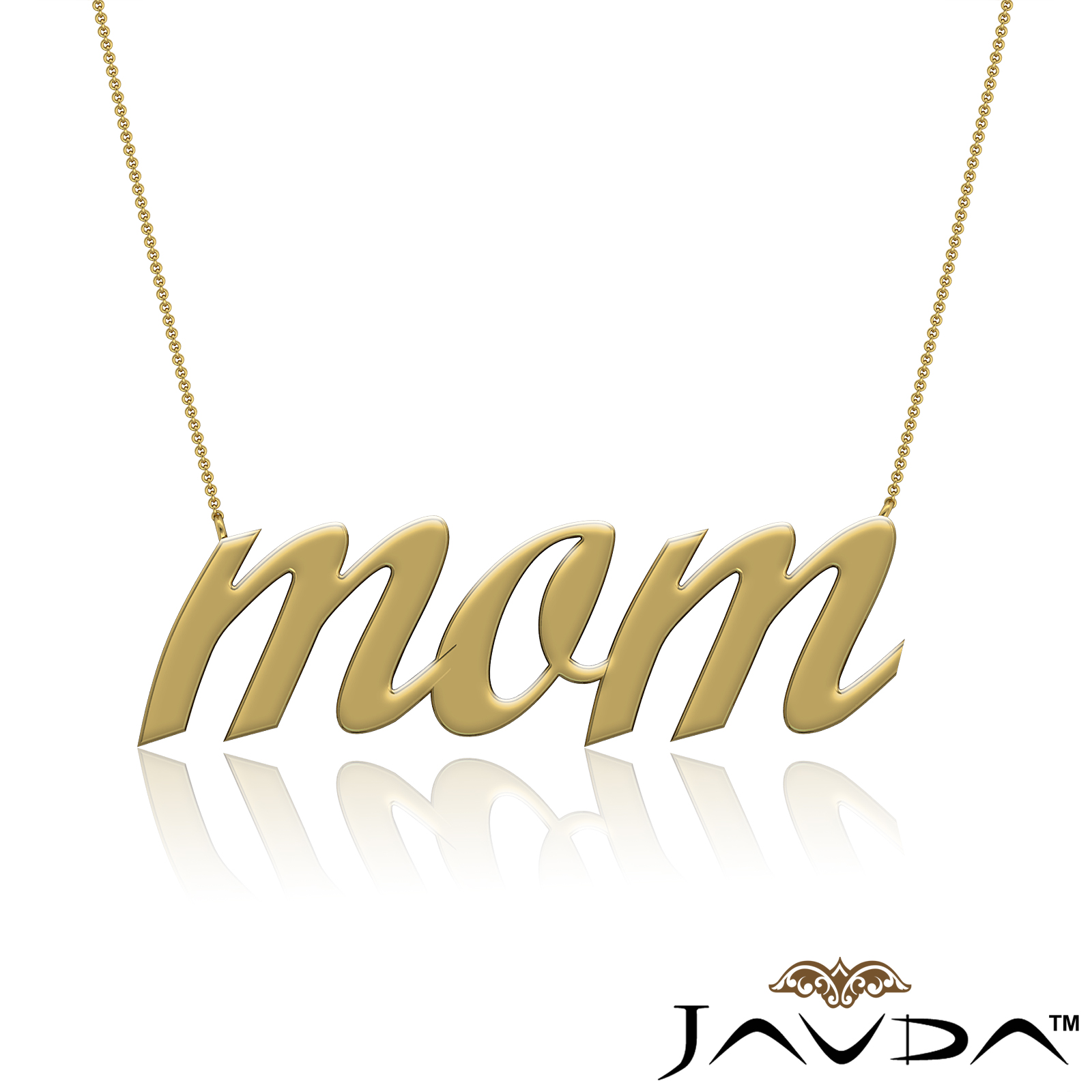 Celebrate your love for her with custom mom script font pendant personalized necklace made with 14k yellow gold. For the most important woman in our lives, a special gift for mothers day.