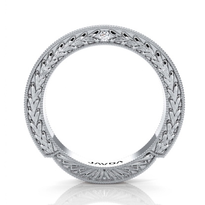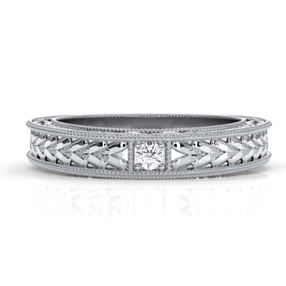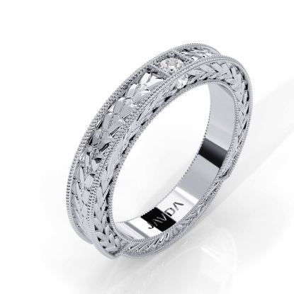 This elegant vintage-inspired wedding band is crafted in 14K white gold and features a beautifully hand-engraved wheat leaf pattern along the entire band. Delicate milgrain edges enhance the antique charm, while 0.06Ctw. round diamond accent adds a subtle sparkle. Designed with a comfort-fit interior, this ring is perfect as a wedding band, anniversary ring, or a stacking band to pair with your engagement ring. Also available in 14k & 18k white gold, yellow gold, rose gold and platinum 950.