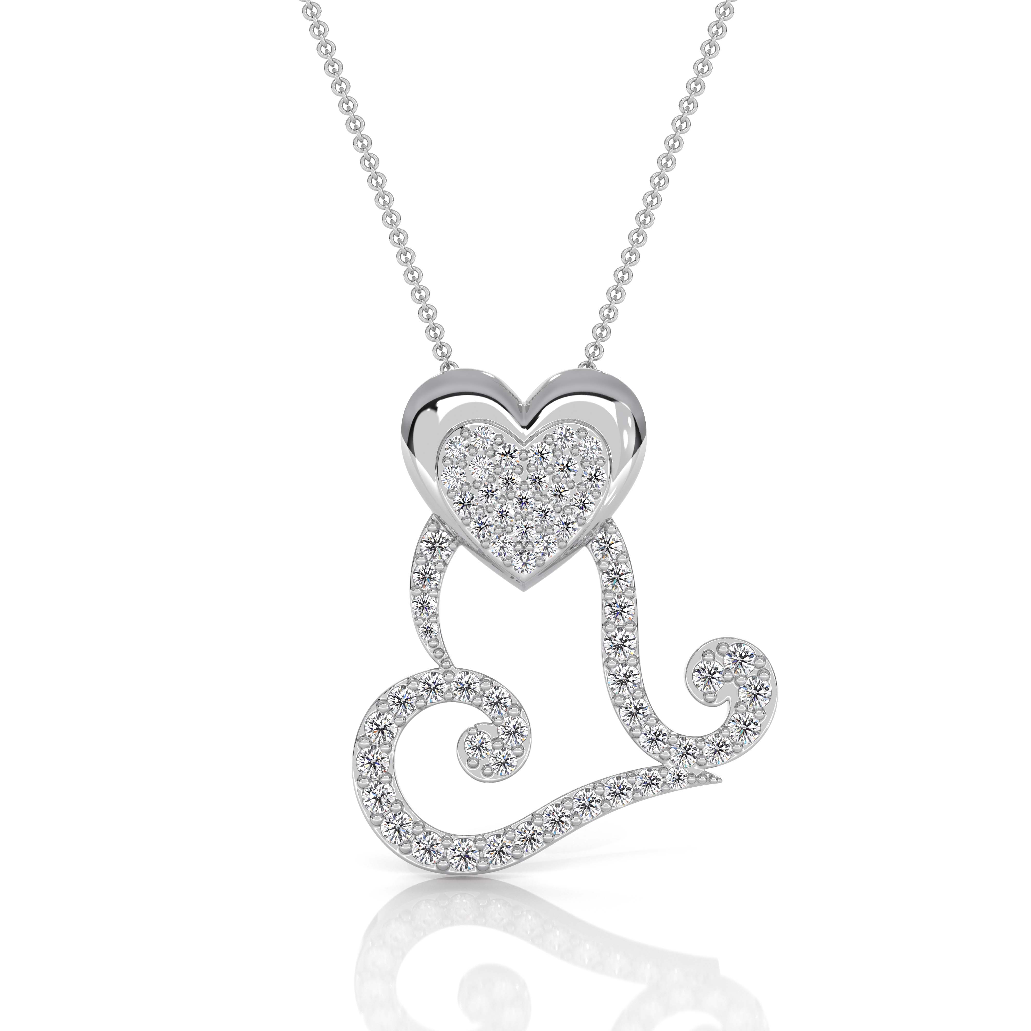 This elegant heart scroll pendant is beautifully crafted in solid 14K white gold and designed to symbolize love, movement, and timeless romance. The pendant features a polished heart centerpiece filled with shimmering round lab grown diamonds, flowing into a graceful scroll silhouette accented with additional diamonds along the curves. A total of 62 round diamonds are carefully set to enhance brilliance and sparkle from every angle, with a combined diamond weight of approximately 0.33 carats. The smooth high-polish finish contrasts perfectly with the pave diamond setting, creating a refined and luxurious appearance. Weighing approximately 2.45 grams, this pendant offers a comfortable yet substantial feel, making it ideal for everyday elegance or special occasions.