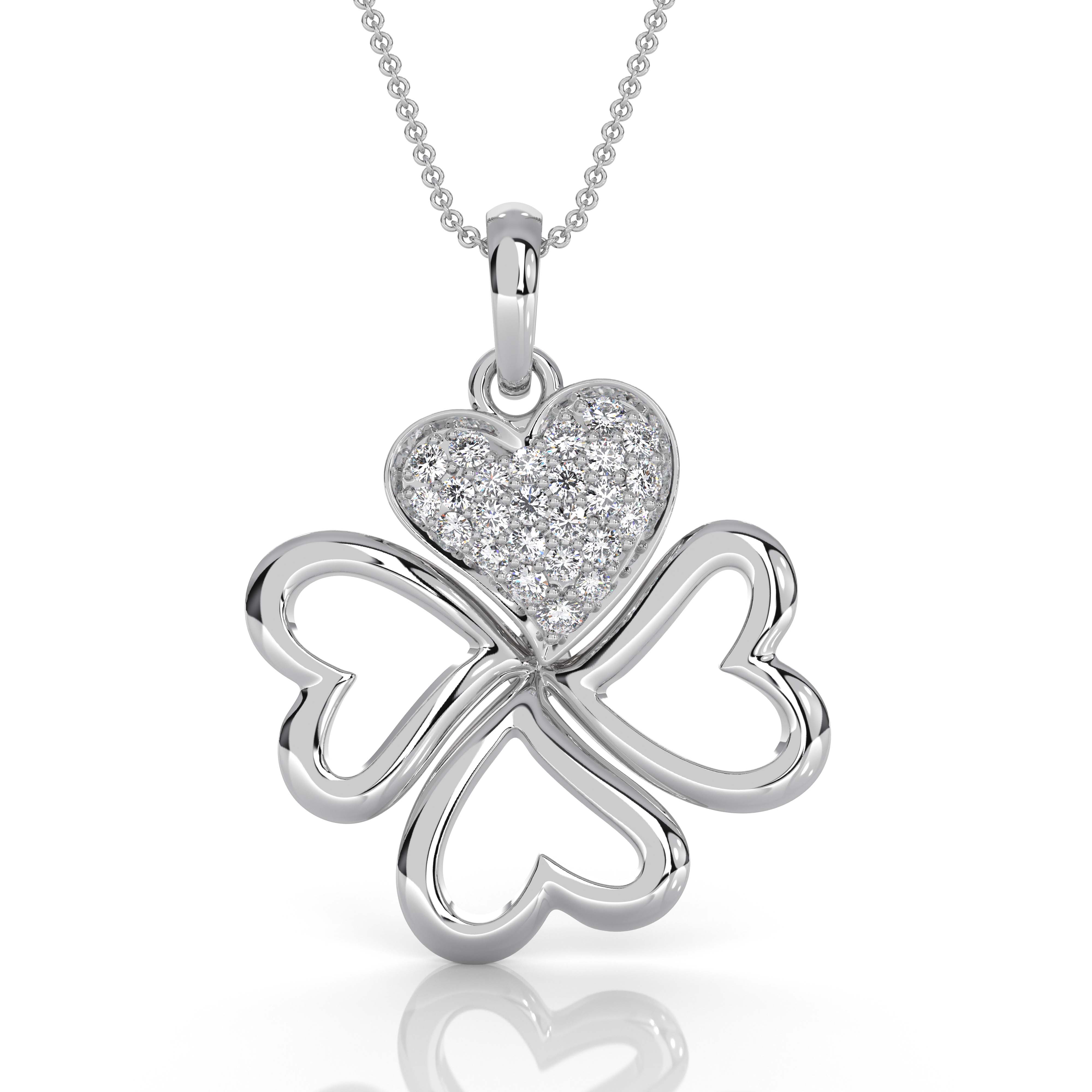 14K White Gold Lab Grown Diamond Heart Clover Pendant Necklace Pave Set 0.22ctw.