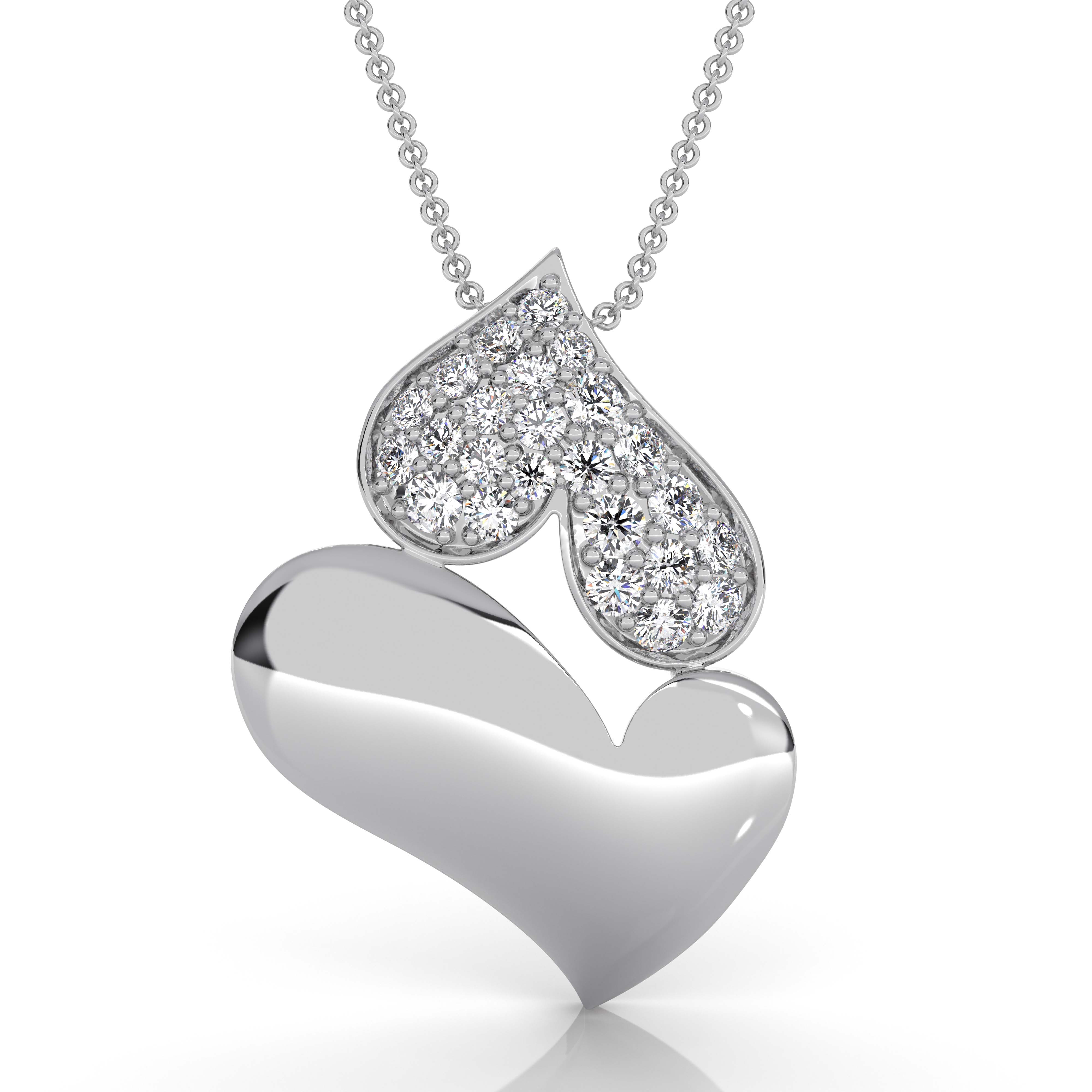 This elegant heart pendant is crafted in solid 14K white gold and features a romantic dual-heart design accented with brilliant pave-set lab grown diamonds. The pendant showcases 24 round diamonds with a combined total weight of approximately 0.24 carat, delivering exceptional sparkle and refined brilliance. The polished white gold finish enhances the contrast between the smooth heart and the diamond-set heart, creating a timeless and luxurious look. Weighing approximately 2.6 grams, this pendant offers a substantial yet comfortable feel, making it ideal for everyday wear or special occasions.