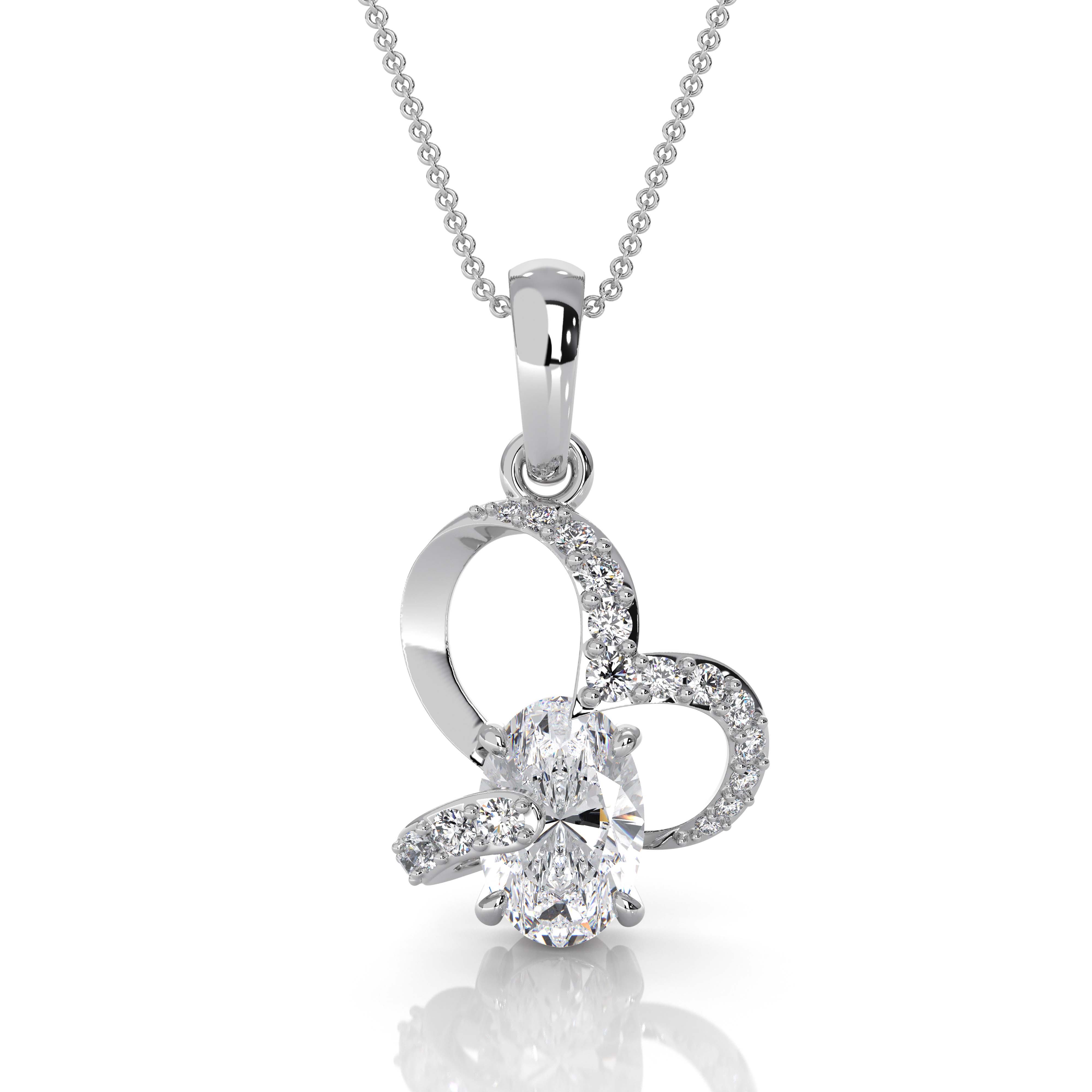 This elegant heart pendant is crafted in solid 14K white gold and features a graceful open-heart design highlighted with sparkling pave-set round diamonds. At the center, a brilliant oval-cut diamond creates a striking focal point, delivering exceptional fire and brilliance. The pendant is set with a total of 19 diamonds with a combined total gem weight of approximately 1.70 carats lab grown diamnds. The polished gold finish enhances the overall luxury appeal while offering a timeless and romantic look. With an approximate total weight of 2.55 grams, this pendant provides a refined yet substantial feel, perfect for everyday elegance or special occasions.