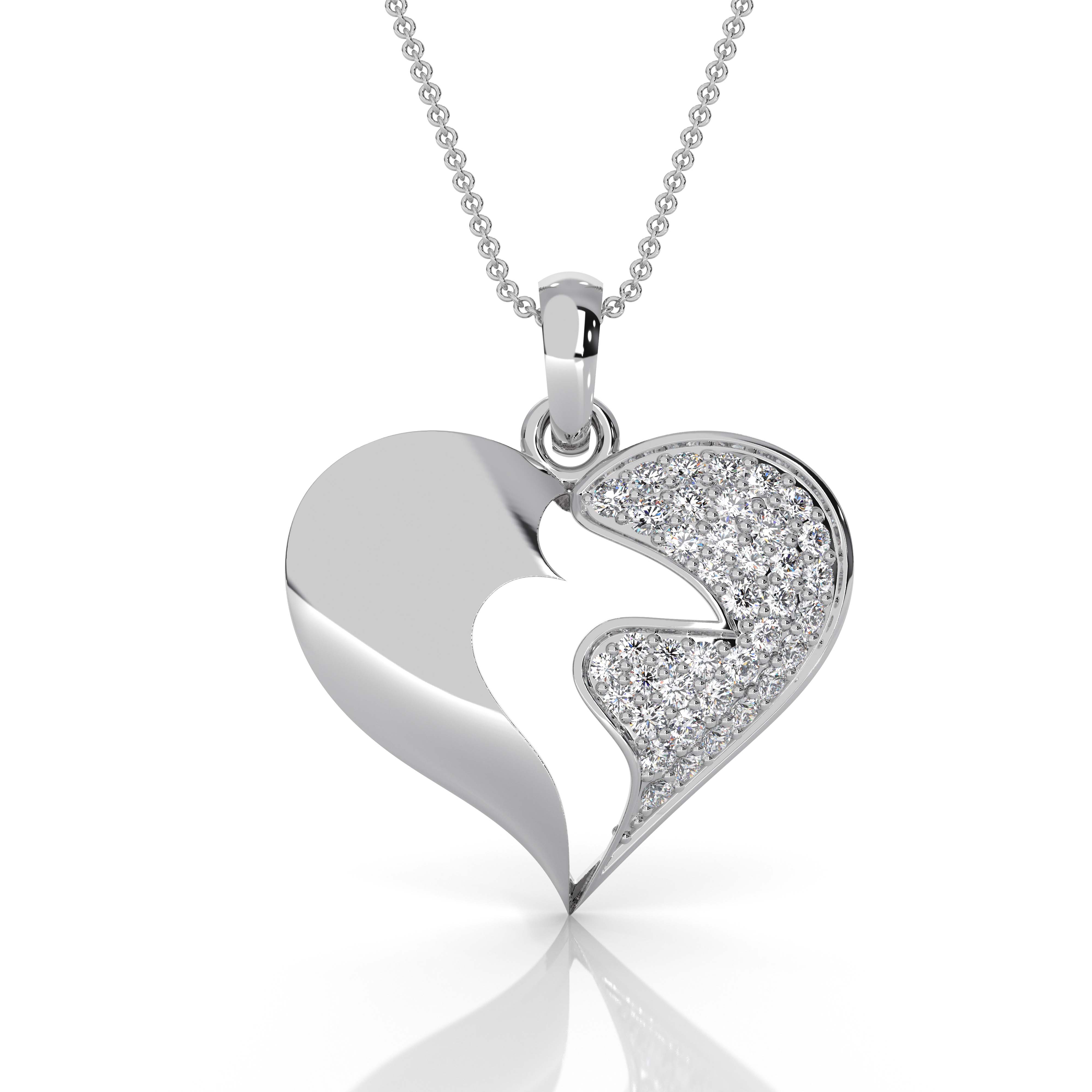 Expertly crafted in solid 14K white gold, this elegant heart pendant features a striking split-heart design combining a high-polish gold surface with a diamond-encrusted pave section for beautiful contrast. The pendant is accented with 39 lab grown round diamonds totaling approximately 0.26 carats, creating eye-catching sparkle and depth. The smooth contours and refined finish give this piece a modern yet timeless appeal. This pendant has an approximate gold weight of 2.65 grams, offering a comfortable and substantial feel. A perfect symbol of love and affection, ideal for Valentine?s Day, anniversaries, birthdays, or special occasions.
