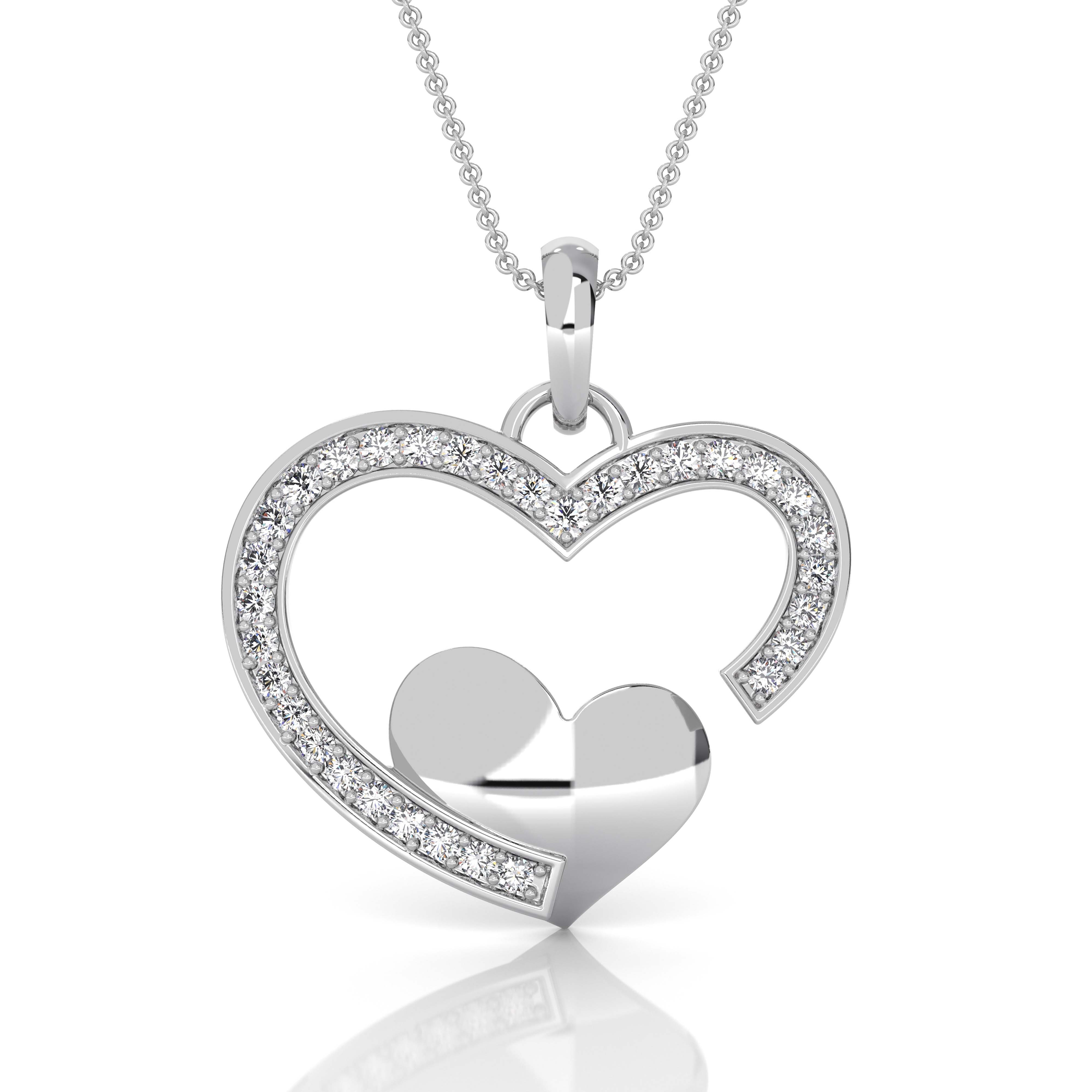 Crafted in solid 14K white gold, this elegant pendant features a graceful open-heart design accented with a polished inner heart for a modern romantic look. The outer heart is adorned with 32 lab grown round diamonds totaling approximately 0.24 carats, adding beautiful sparkle and refined brilliance. The high-polish gold finish enhances the flowing curves and timeless appeal of the design. This pendant has an approximate gold weight of 2.40 grams, making it comfortable for everyday wear while still feeling substantial. A perfect symbol of love and affection, ideal for Valentine?s Day, anniversaries, birthdays, or special gifting occasions.