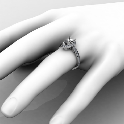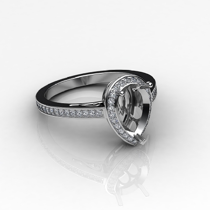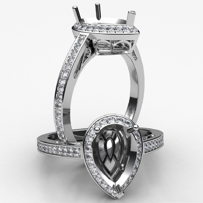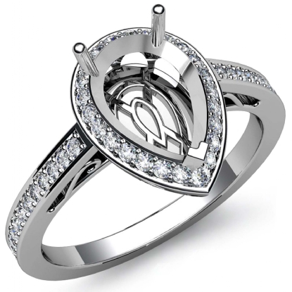Undeniably striking, this pear semi mount diamond engagement ring is made in 14K white gold. It displays 0.50ct. pave set round diamonds in halo & along the shank.
