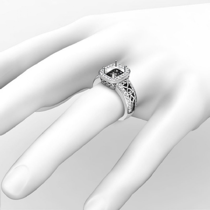 Unapologetically modern, this 14K white gold diamond engagement ring showcases a cushion semi mount. It displays 0.75ct. round pave diamonds in halo & along the beautiful shank with delicate filigree.