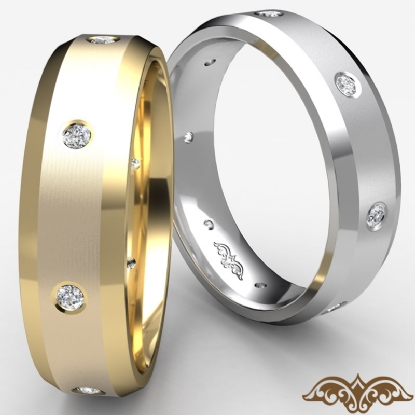 A classic style solid 14k white gold brushed finished diamond eternity men's wedding band. Featuring beveled edge with 0.15 carat total round diamonds in a bezel setting.