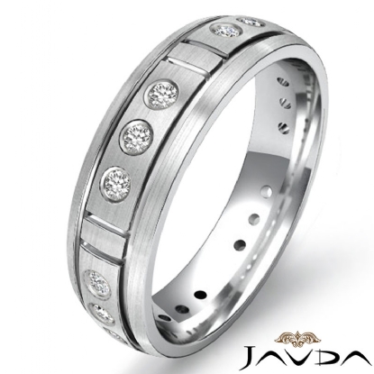 Solid matte men's eternity wedding band made from 14k white gold. The ring has a parallel grooved with center cut and 0.23 carat total round diamonds set in a bezel setting.