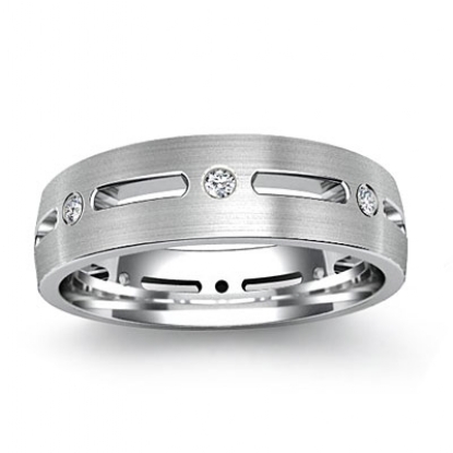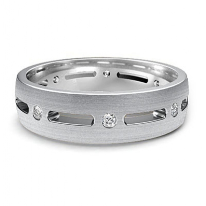 Solid bezel set diamond matte finished men's eternity wedding band made from 14k white gold. Featuring 0.15 carat diamonds set in a bezel setting with center cut.