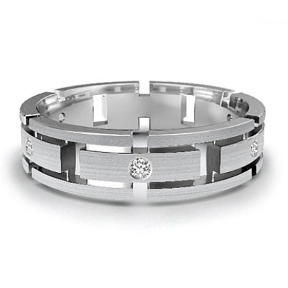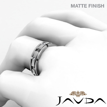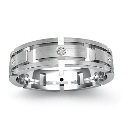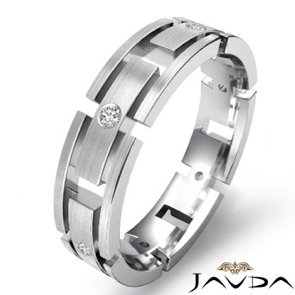 Handsome matte finished bezel set diamond men's eternity wedding band crafted in 14k white gold. This ring features solid link, each link is adorned with a beautiful diamond set in a bezel setting.