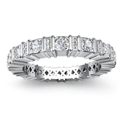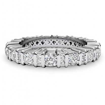 A beautiful 14 karat White Gold Eternity Wedding Band Ring with 1.8 carats of Round Diamonds in a prong setting with Alternative Diamond Bar set.