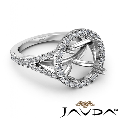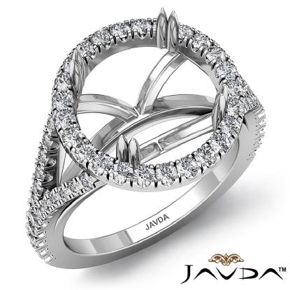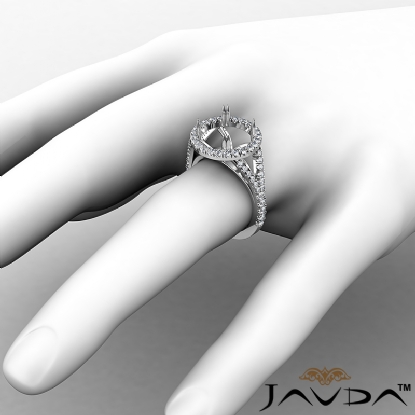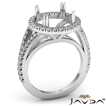 Elegant U split prong halo round semi mount engagement ring made from 14k white gold. This diamond ring features 0.74 carat total round diamonds along the shank and halo in a split prong setting.