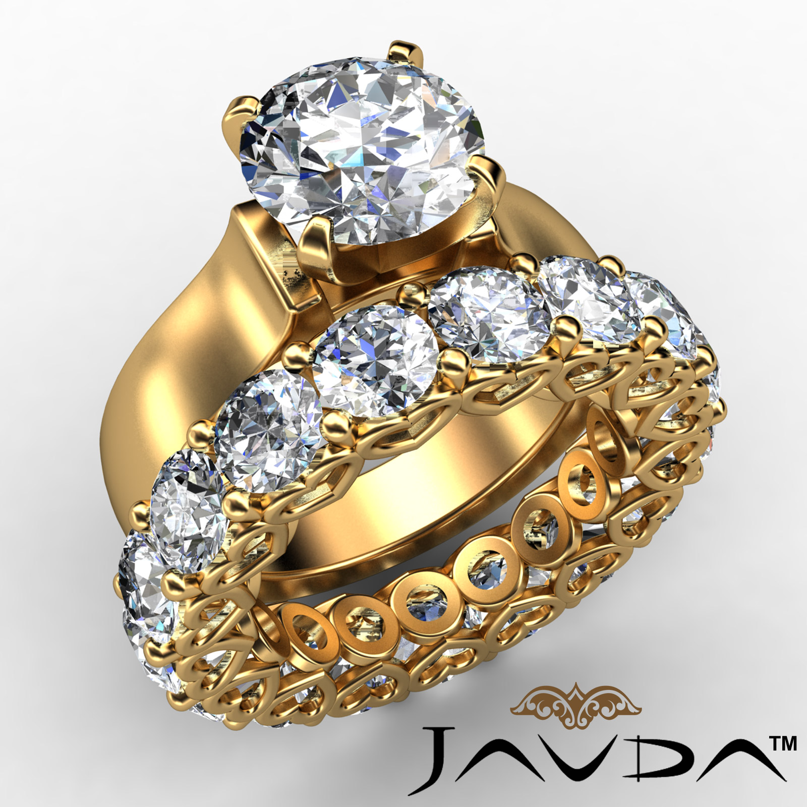 A stunning round diamond engagement bridal set ring made in 14k yellow gold. This bridal set is a perfect pair of solitaire engagement ring and eternity wedding band with a lovely heart filigree. Features 5.05 carat side assent round diamonds in a prong setting and center diamond is of 2 carat J color, SI1 clarity certified by GIA.