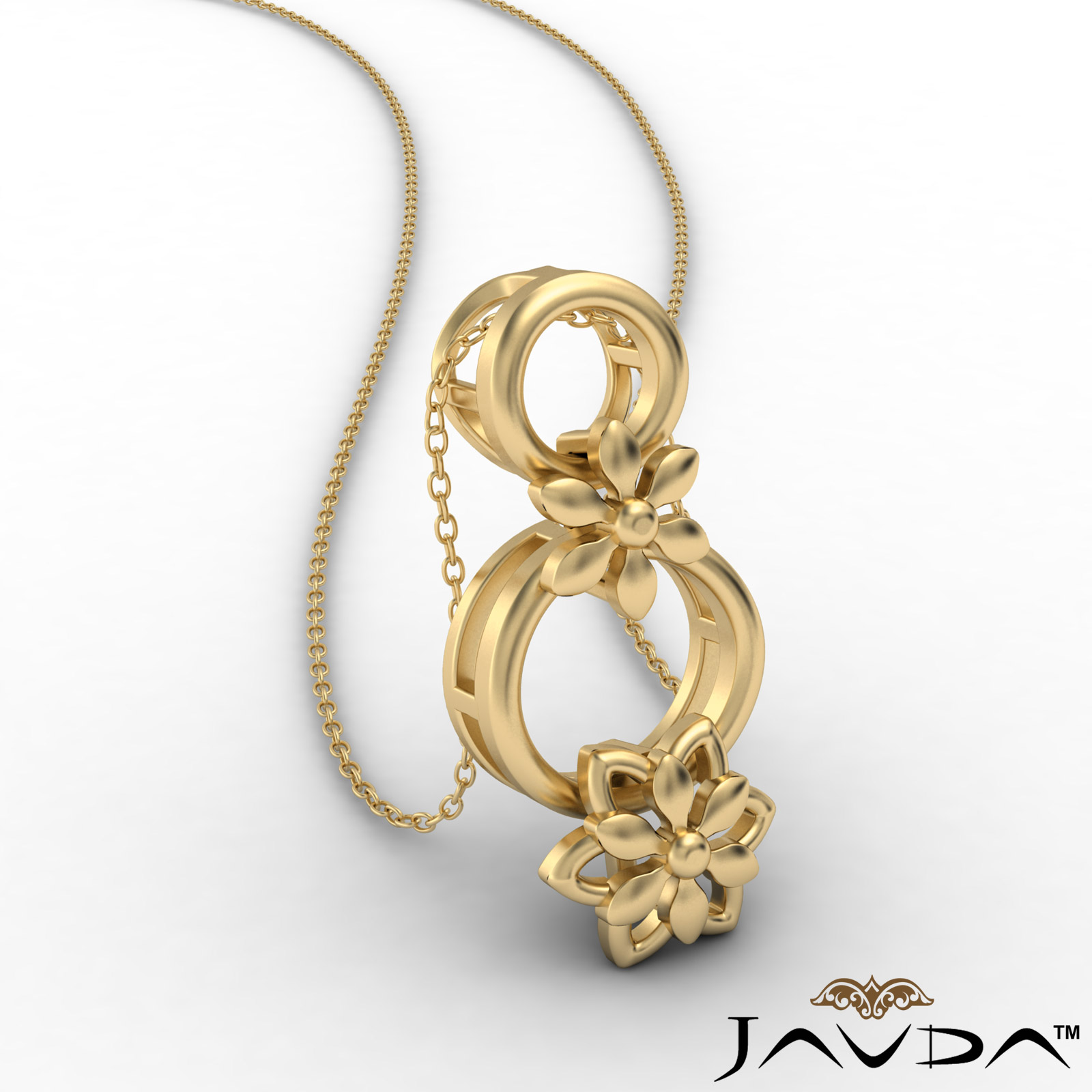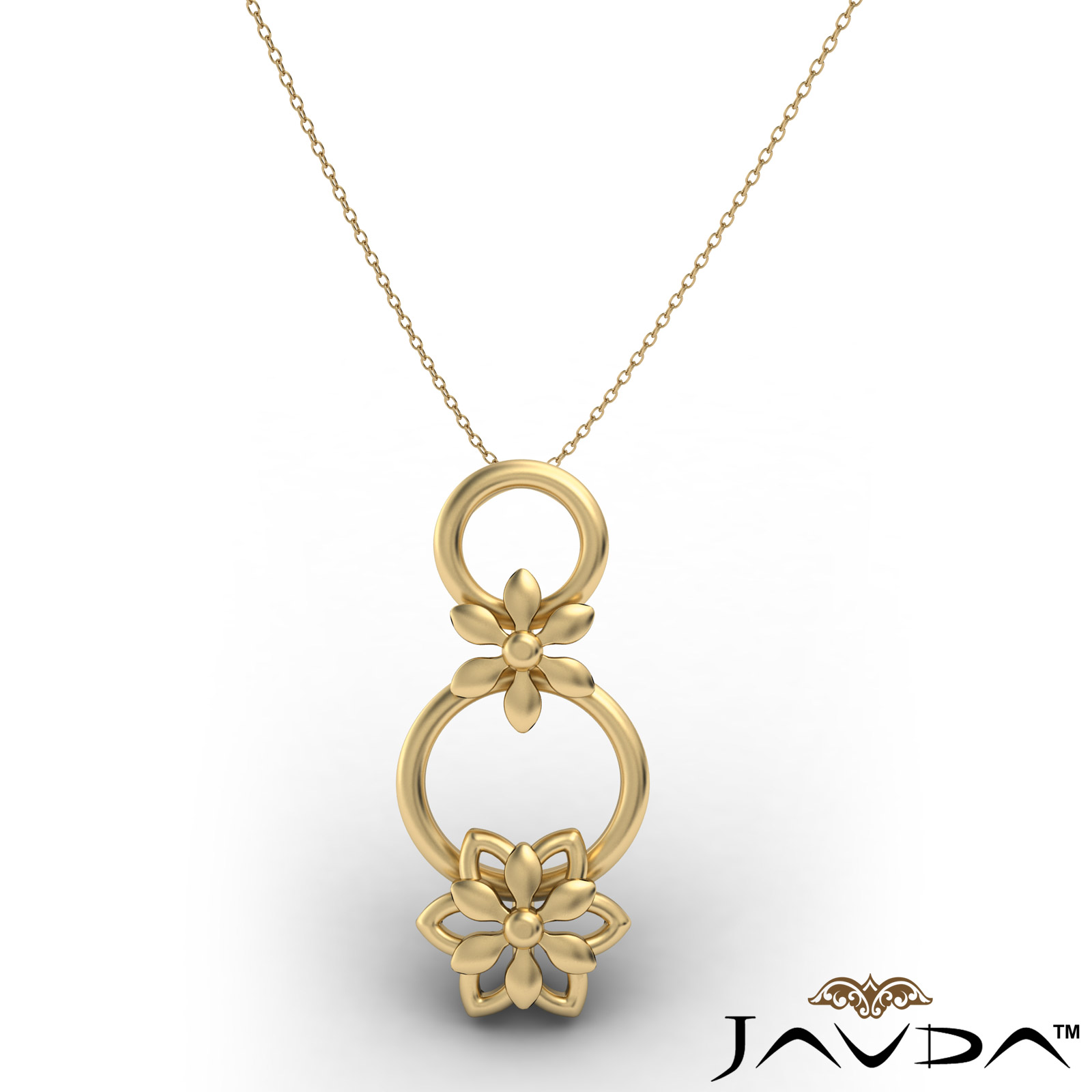 Pretty flower linked gold pendant necklace made in 14k yellow gold. This charming polished finished flower pendant hang on 18 inch rolo chain.