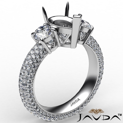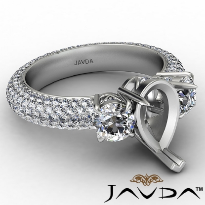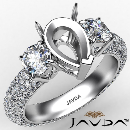Stunning and elegant 3 stone pear semi mount diamond engagement ring crafted in 14k white gold. This gorgeous diamond ring features 2 ct. natural round diamonds beautifuly set on shank in an micro pave setting with 0.64 carat two round side diamonds in a claw prong.