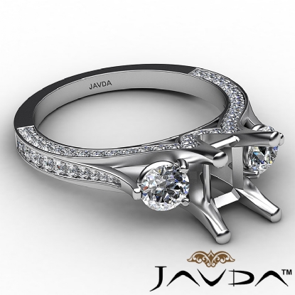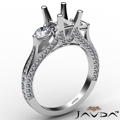Glamorous and elegant, this three-stone semi mount ring triples the shimmer with 0.50ct. side diamonds intensifying the center diamond in prong setting. The smaller 0.70ct. round pave set diamonds decorates the shank. Made in 14K white gold, this ring is the perfect choice!
