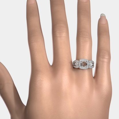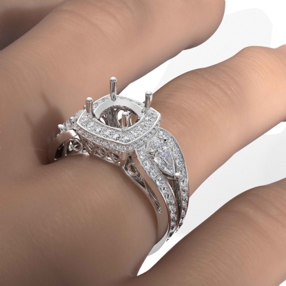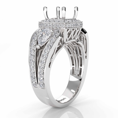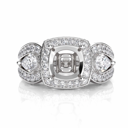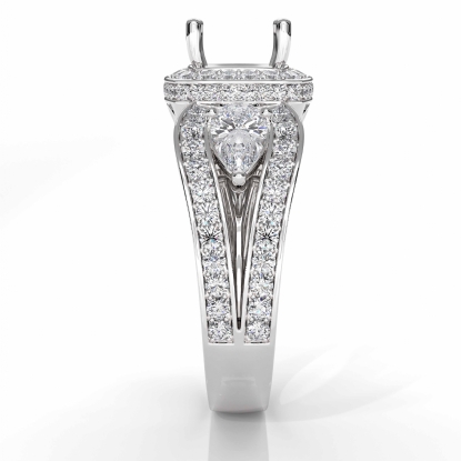 Capture the moment with this 14K white gold 3 Stone engagement ring, featuring a cushion semi-mount halo of round diamonds. It showcases 1.85ct. of total round diamonds & 0.50ct. of side pear diamonds in prong setting beautifully placed on the ring's shank.