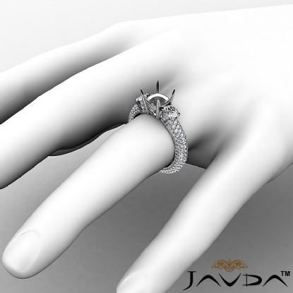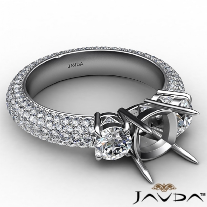 Beautiful in its own way! This 2.6ct. & 14K white gold ring is scintillating. A semi mount cushion center diamond, clustered by two round cut side diamonds are all in prong setting. Pave set diamonds on the shank set the standards high!