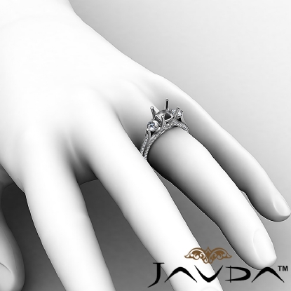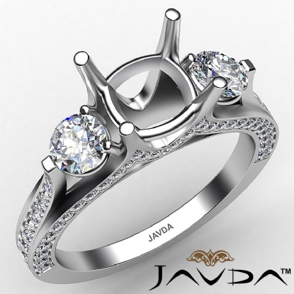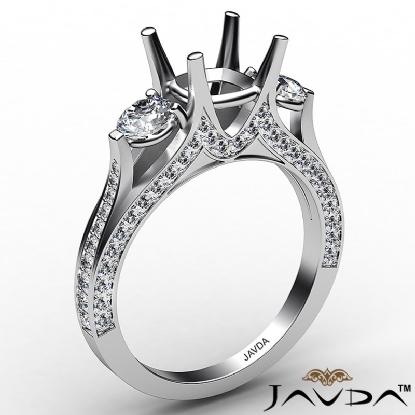 Glamorous and elegant, this three-stone cushion semi mount ring triples the shimmer with 0.30ct. side diamonds intensifying the center diamond in prong setting. The smaller 1ct. round pave set diamonds decorates the shank. Made in 14K white gold, this ring is the perfect choice!
