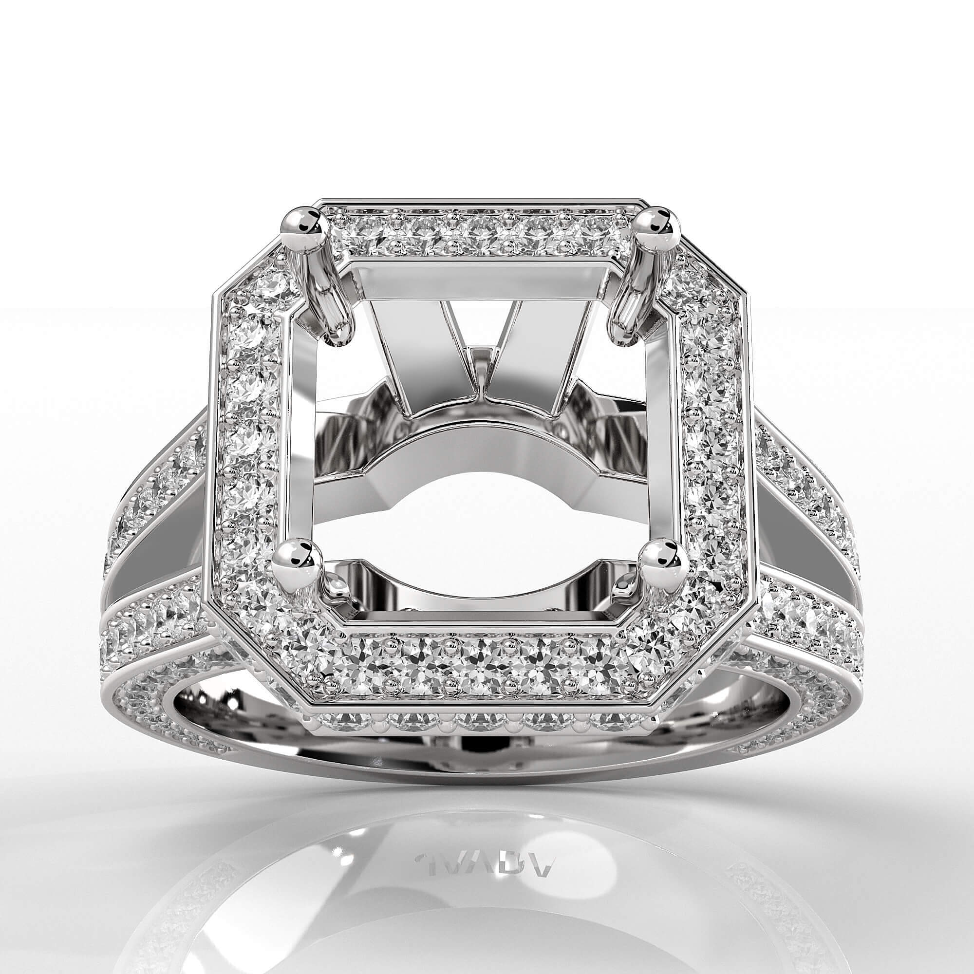 Made in 14K white gold & unique in design, this 1.5ct. women's diamond engagement ring showcases a asscher semi-mount halo of round pave-set diamonds, along with split shank setting on the shank.