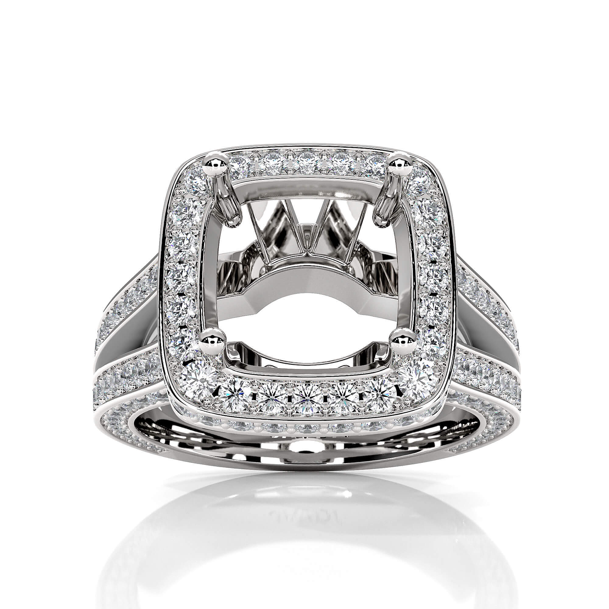 Made in 14K white gold & unique in design, this 1.5ct. women's diamond engagement ring showcases a cushion semi-mount halo of round pave-set diamonds, along with split shank setting on the shank.