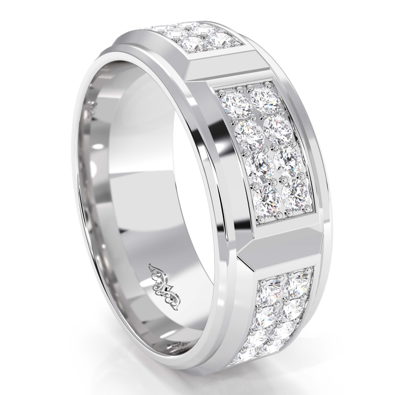 Classic luxurious 2 row round diamond eternity men's wedding band expertly crafted from the finest precious metal. This designer jewelry piece is perfect for modern groom. Features polished edges and vertical center cuts with 1.43 carat round diamonds in a micro pave setting. Available in 14k & 18k white gold, yellow gold, rose gold and platinum 950.