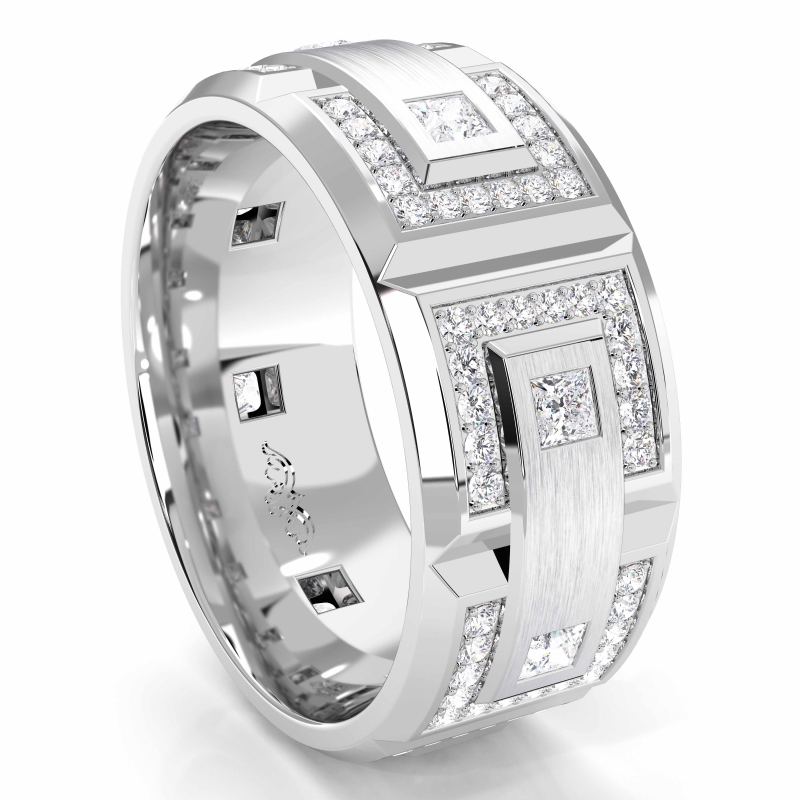 A perfect peice of jewelry for modern groom link design diamond eternity men's wedding band crafted in 14k white gold. Features 1.35 carat round diamonds in a micro pave setting and princess diamond in a bezel setting on matte finished with vertical grooved in polished finish. Available in 14k & 18k white gold, yellow gold, rose gold and platinum 950.
