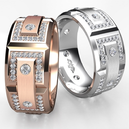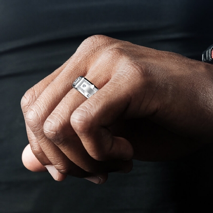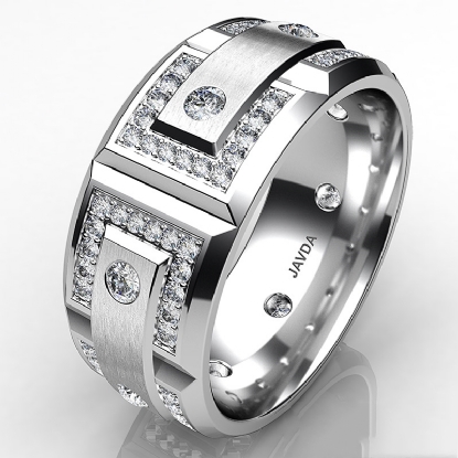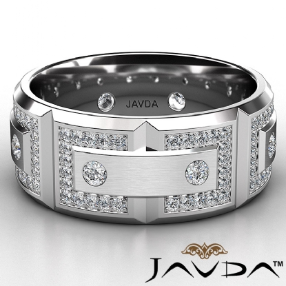 Luxurious modern and striking diamond eternity men's wedding band crafted in precious metal 14k white gold. This wedding band features 1.10 carat round diamonds in a micro pave setting and bezel set diamond on matte finish detailing with polished finish edges. Available in 14k & 18k white gold, yellow gold, rose gold and platinum 950.