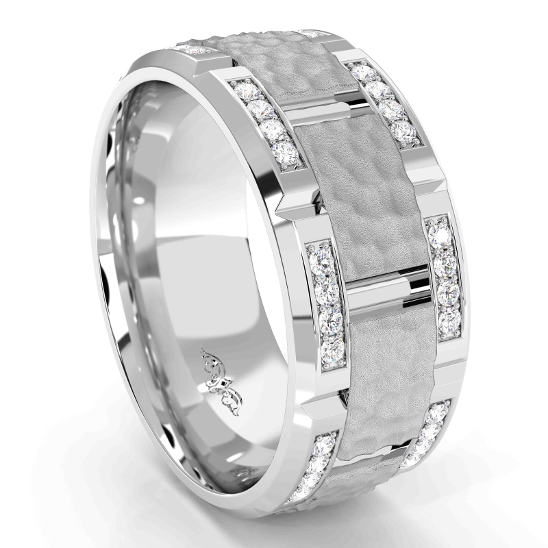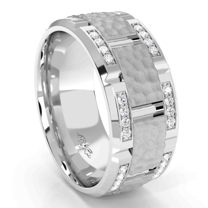 This stylish hammered finish diamond eternity men's wedding band crafted in 14k white gold. Features 0.50 carat round diamonds in a micro pave setting and polished finish edges with the contrasting textures of hammered in center. Available in 14k & 18k white gold, yellow gold, rose gold and platinum 950.