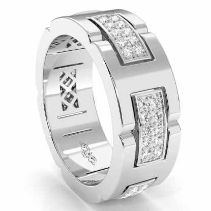Dazzling matte finish diamond eternity men's wedding band crafted in 14k white gold. This hot wedding band features 0.90 carat round diamonds in a micro pave setting with a beautiful matte finish detailing. Available in 14k & 18k white gold, yellow gold, rose gold and platinum 950.